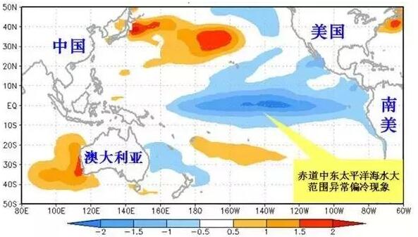 名词解释:拉尼娜(西班牙语“LaNina”),原意是“小女孩”,也称为“反厄尔尼诺”,一般以西经120~170度及南北纬5度之间的赤道太平洋海区的海温距平指数来判定。当该区海温距平低于-0.5℃,则称之为进入“拉尼娜状态”;若“拉尼娜状态”持续5个月以上,则判定为一次“拉尼娜事件”(见图2)。拉尼娜事件一般2至7年发生一次,1950年以来共发生了14次。“拉尼娜”和“厄尔尼诺”都是导致全球气候异常的重大天气气候事件之一。