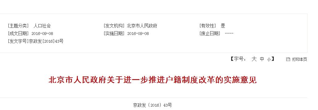 《北京市人民政府关于进一步推进户籍制度改革的实施意见》 京政发〔2016〕43号:http://www.3jise.com/article/62378.html