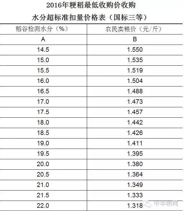 2016年我省粳稻最低收购价格为标准品每市斤1.55元,以2016年生产的国标三等粳稻为标准品。具体质量标准按稻谷国家标准(GB1350-2009)执行,指标为:出糙率77%~79%(含77%,不含79%),整精米率55%~58%(含55%,不含58%),水分14.5%以内,杂质1%以内,谷外糙米2%以内,黄粒米1%以内。相邻等级之间等级差价为每市斤0.02元。最低收购价是指承担最低收购价收购任务的收储库点向农民直接收购标准品的到库价。
