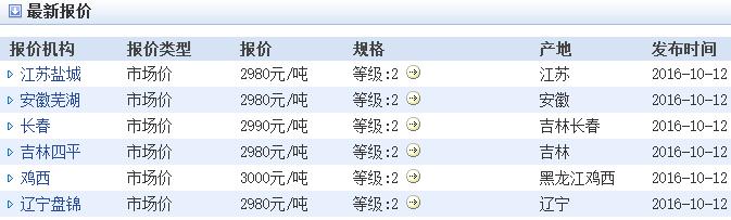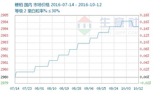 2016(10月3日~7日),水稻市场整体维稳,市场“粳强籼弱”局面依旧突出。目前,东北产区正处新陈粮交替的时期,黑龙江省佳木斯市部分加工企业2015年产普通圆粒粳稻收购价3220元/吨,比上周上涨20元/吨。江苏省南京市地产陈稻收购价2940元/吨,地粳稻价差为280元/吨,相比节前有所扩大。随着东北产区初霜来临,粳稻开始集中上市,作为执行政策性收储的惟一粮食品种,多方主体入市带动新季粳稻价格同比高开。