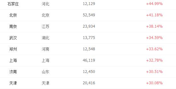 数据显示,涨幅同比去年超30%的有8城,分别为石家庄、北京、南京、武汉、郑州、上海、济南、天津,涨幅分别为近45%、41%、38%、35%、34%、33%、31%、30%。除广州外,除石家庄外,前期重点调控的一线和热点二线均在内。其中合肥未测算出具体涨幅数据,预计涨幅空间也比较大。