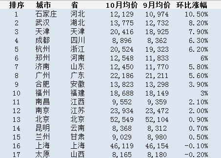 据中国房地产业协会发布网站数据,2016年10月份31省会城市房价排行出炉,其中,石家庄领涨全国,同比去年涨近45%,从10月以来,在已出台调控政策的一线和热点二线城市中,石家庄未在其中。值得一提的是,均价排第一的北京涨幅惊人,涨近41%,报均价约每平米5.3万。