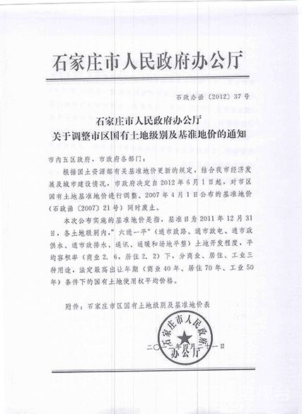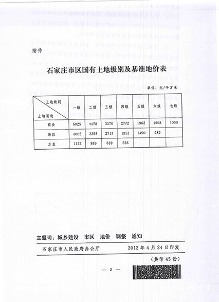 据了解,此文件印发日期为2012年4月24日,与石家庄市政府曾在2012年4月25日发布《关于调整市区国有土地级别及基准地价的通知》相同,通知中显示,自2012年6月1日起,石家庄市区国有土地基准地价进行调整。调价后,石家庄一级居住用地的基准地价从之前的2802元/平方米调整为4002元/平方米。