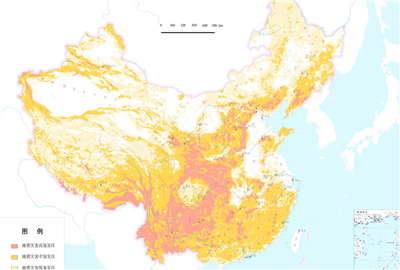 依据地形地貌、岩土体类型及性质、地质构造以及地下水特征与开采状况等地质灾害形成的地质环境条件和人为活动因素,把全国地质灾害易发地区分成高、中、低三级地质灾害易发区。