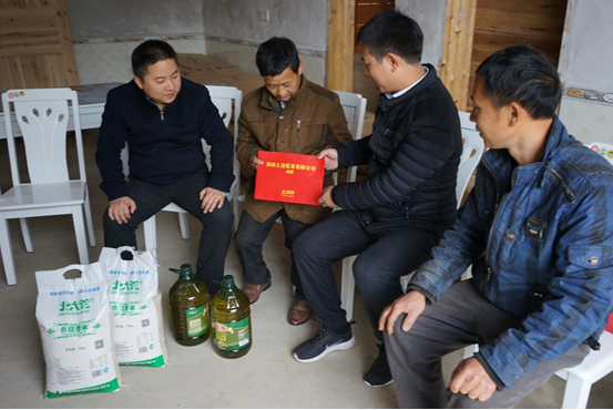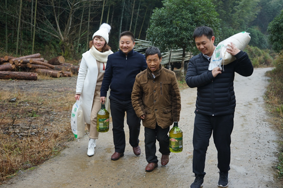 土流网CEO与天心区经信局秦局长、符局长一起,在富溪村相关村干部陪同下,在纷纷扬扬的细雨中步行前往定点帮扶对象李元德家中,为他们送去过年所需的粮油物资及新春的美好祝福。