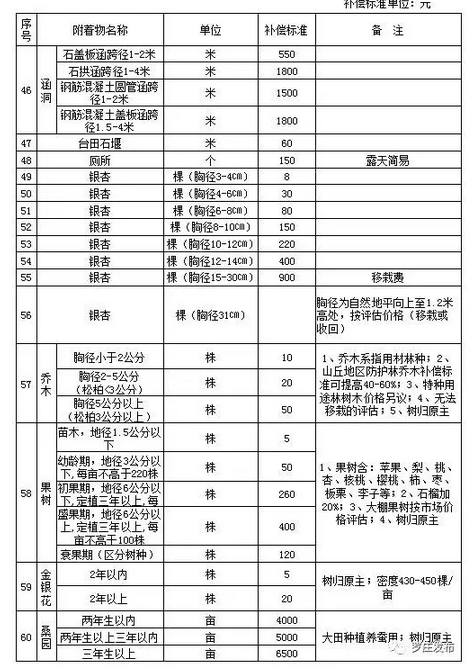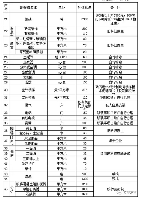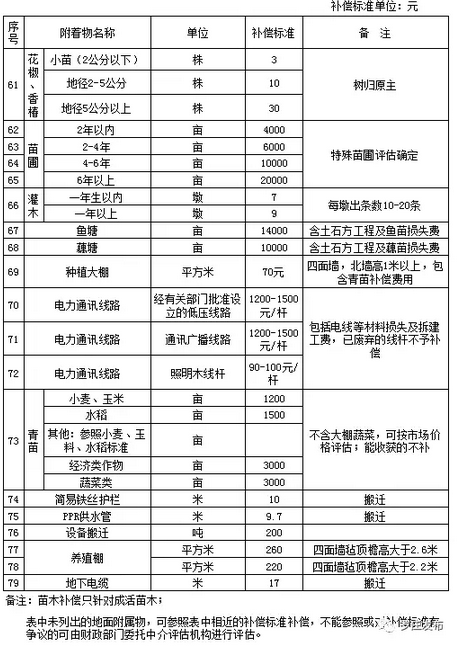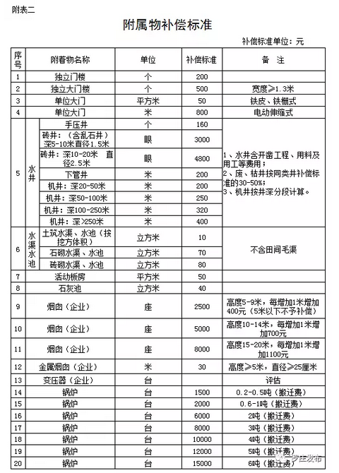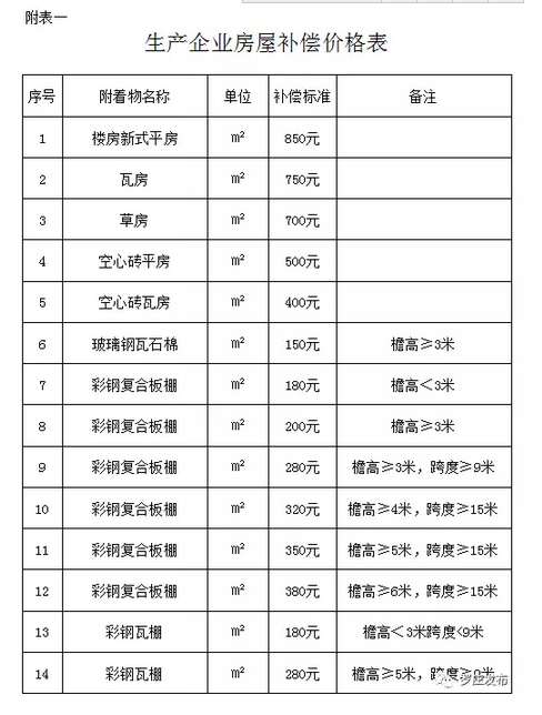 (1)一般厂房、办公用房的标准见附表一,附属物的补偿标准见附表二。