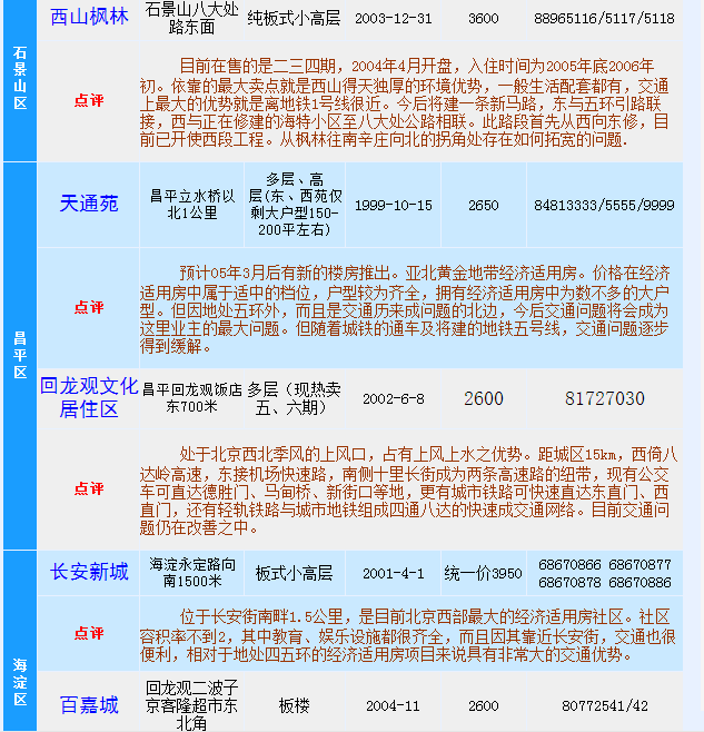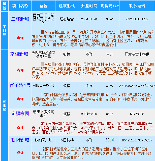 3、这8个下半年新加的经济适用住房项目加上年初已确定的世纪风景、乐城、垡头翠城、长安新城二期、翠谷玉景等经济适用房项目,今年的经济适用房改变了以往北多南少的局面,从长安新城、翠谷玉景以及新近亮相的三环新城的认购情况看,城南城西的经济适用住房受北京人欢迎。