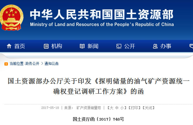 国土资源部办公厅关于印发《探明储量的油气矿产资源统一确权登记调研工作方案》的函