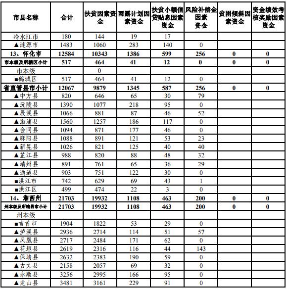 一、资金安排原则。本批次资金全部按照因素法测算到县。在测算的因素中,贫困县考虑了扶贫因素、雨露计划因素、小额信贷贴息因素、风险补偿金因素和贫困倾斜因素五个因素;非贫困县考虑了扶贫因素、雨露计划因素、小额信 贷贴息因素、风险补偿金因素、资金绩效考核奖励因素和贫困倾斜因素六个因素。
