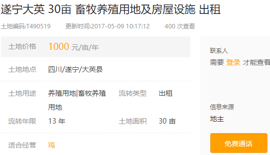 如果不想自己耕种经营的话,通过土地流转专业平台把土地流转出去是个不错的选择,不仅让土地得到利用,自己还可以拿一笔流转费。如大英县某农场主就在土流网上发布了自己的畜牧养殖用地出租信息: