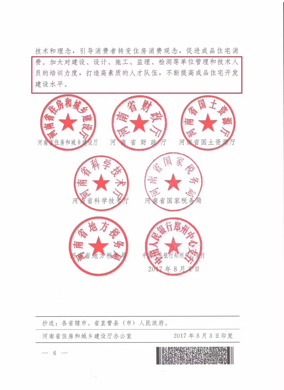 8月22日,河南省住房和城乡建设厅、河南省国土资源厅等七部门联合印发《关于加快发展成品住宅的指导意见》,明确了成品住宅建设的目标,2018年1月1日起,河南全省所有巿、县新开工建设商品住宅,全部要按照成品住宅设计建设(不含4层以下住宅及单套面积大于200平方米的住宅)。