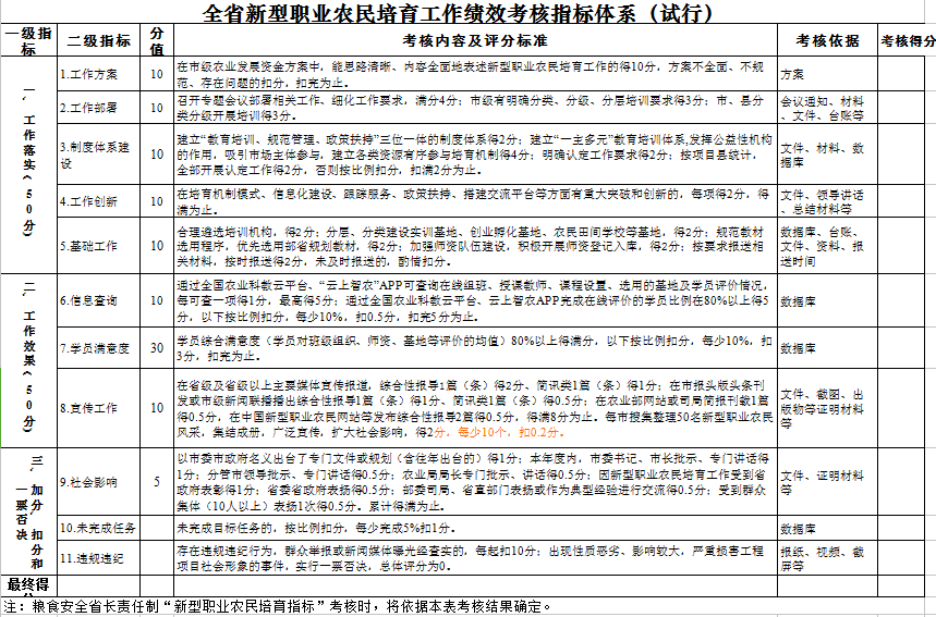 (二)加强考核管理。新型职业农民培育工作实行分级管理、分层负责,全面推行绩效管理。要落实好粮食安全省长责任制中新型职业农民培育考核,按照《全国新型职业农民培育工作绩效考核指标体系》(见附件),全面开展绩效考核工作。今年要对培训教师、培训班组织和培训效果实行线上考核,考核结果将与任务资金安排、评优奖励挂钩。