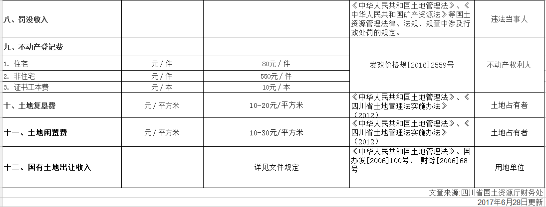 耕地开垦费、新增建设用地土地有偿使用费、探矿权使用费、探矿权价款、采矿权使用费、采矿权价款、专业技术职务任职资格评审收费、不动产登记费、罚没收入、土地复垦费、土地闲置费、国有土地出让收入等12项收费项目做出了明示,具体详见下表。