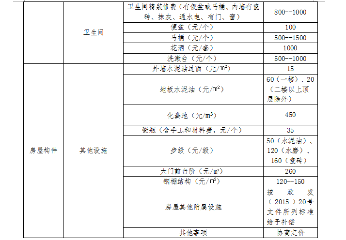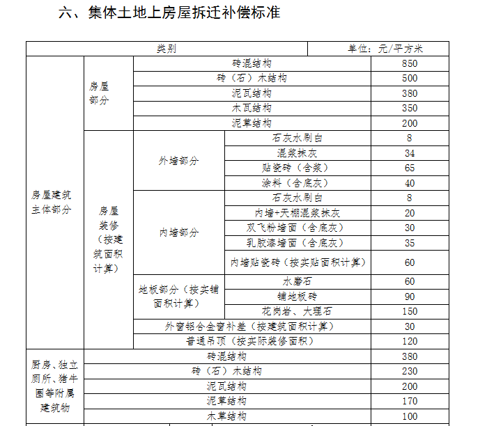 (二)砖木结构:木屋架、木檩条或砖石承重,小青瓦或机制瓦屋面,层高4米以下。其中木质窗,铁质大门,水、电,厨房,卫生间基本配套,清水内外墙等属于装修部分,不计算在单价500元/平方米以内,另行计价。