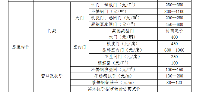 (三)简易结构:檩条承重,小青瓦、机制瓦或石棉瓦屋面,层高3.5米以下。其中木质门窗,水、电,厨房,卫生间等属于装修部分,不计算在单价350元/平方米以内,另行计价。