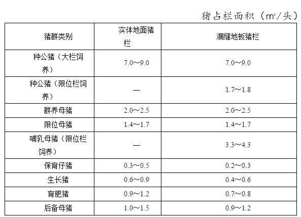 猪只占栏面积要达到下表要求。除限位饲养的公猪、妊娠母猪、产仔母猪外任何情况下所有的猪都可以自由转身同时躺卧。
