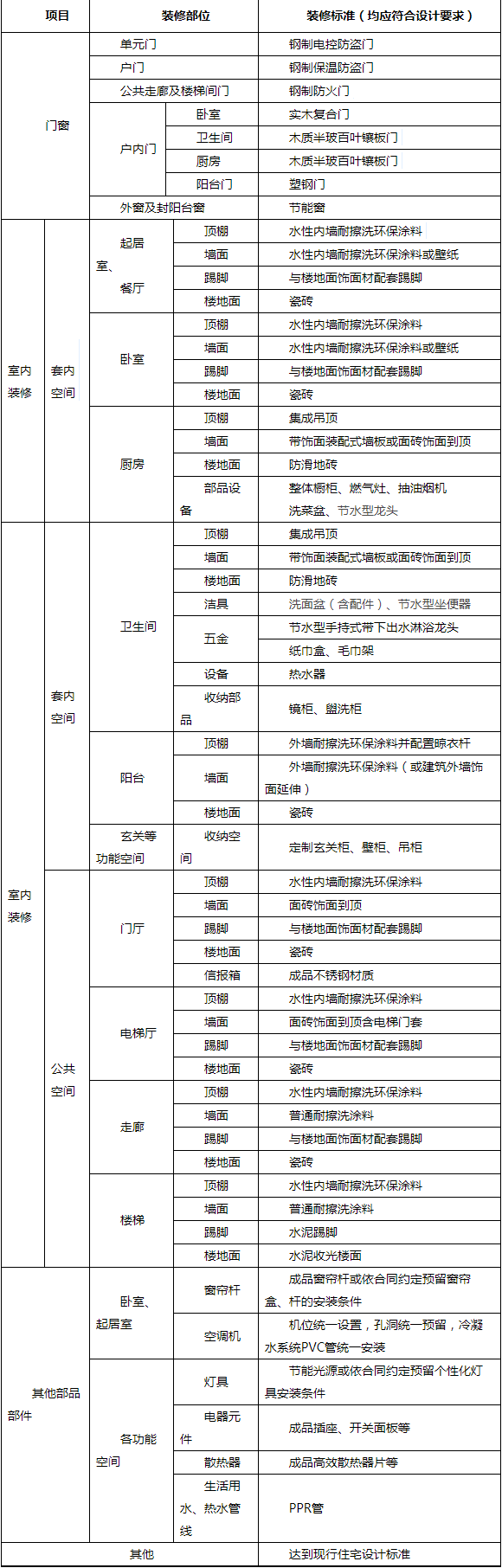 1.0.3共有产权住房应按照适用、经济、安全、绿色、美观的要求规划设计建设,全面实施装配式建造、全装修成品交房,执行绿色建筑二星级及以上标准。倡导“互联网+城市规划建设管理”的新理念。