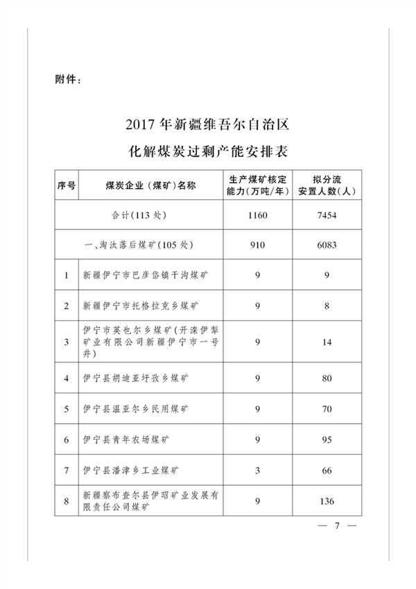 近日,新疆维吾尔自治区人民政府印发了《自治区2017年度煤炭行业化解过剩产能实施方案》。方案指出,2017年自治区计划淘汰、引导退出煤矿113个,产能(规模)1160万吨/年,其中:引导退出煤矿8个,产能(规模)250万吨/年;淘汰退出小煤矿105个,产能910万吨/年。
