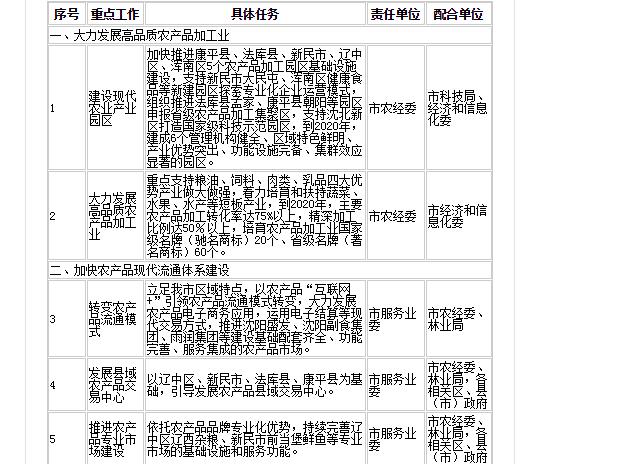 4.大力发展高品质农产品加工业。建设现代农业产业园区,加快推进康平县、法库县、新民市、辽中区、浑南区等5个农产品加工园区基础设施建设,支持新民市大民屯、浑南区健康食品等新建园区探索专业化企业运营模式,组织推进法库县孟家、康平县朝阳等园区申报省级农产品加工集聚区,支持沈北新区打造国家级科技示范园区,到2020年,建成6个管理机构健全、区域特色鲜明、产业优势突出、功能设施完备、集群效应显著的园区。大力发展高品质农产品加工业,重点支持粮油、饲料、肉类、乳品四大优势产业做大做强,着力培育和扶持蔬菜、水果、水产等短板产业,到2020年,主要农产品加工转化率达75%以上,精深加工比例达50%以上,培育农产品加工业国家级名牌(驰名商标)20个、省级名牌(著名商标)60个。(牵头单位:市农经委)