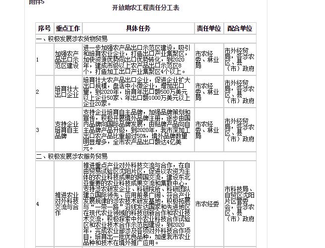 12.积极发展涉农服务贸易。推进重点产业对外科技交流与合作,在自贸区沈阳片区积极促进以农资为主体的农业科技成果跨国交流,着力打造东北亚重要的农业科技成果交流和集散中心,支持涉农研发企业、科研院所、科研团队建立国际领先、应用前景广阔、符合产业发展规律的涉农技术研发基地,持续拓展与“一带一路”沿线发达国家和先进地区在现代农业领域的科技创新合作和农业技术交流,积极探索中外农业科技合作试验区和农业技术合作示范园建设,到2020年,完成农业部涉及我市的各项对外科技合作项目,培育出一批优良品种,加速我市农业品种和技术在境外推广应用。加强农业对外合作人才队伍建设,培养一支政策水平高、服务能力强的行政管理队伍,引进培养一支熟悉各国法律、懂得世贸规则和国际惯例的专业人才队伍,为我市农业对外合作提供专业人才支撑和智力储备。(牵头单位:市农经委、科技局、外经贸局、自贸区沈阳片区管委会)