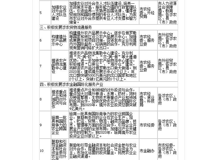 14.积极发展涉农金融国际化服务产业。推进重点产业和领域的对外投资与合作,重点加大对境外粮油、水果、药材、饲料及种苗繁育、生物技术等重点产业和领域的投资合作,加快优势农业产业的国际化布局,到2020年,境外农业投资总额突破4亿美元。培育一批具有国际竞争力的农业跨国企业,鼓励有条件的企业在农业生产、加工、贮运、贸易、物流、融资及品牌、技术、管理等方面的投资合作,引导企业开展全产业链的全球布局,加强对产业关键环节的控制力,到2020年,培育境外农业投资企业20家以上。鼓励和引导金融资本和社会资金参与农业对外合作,搭建政府发起、社会资金为主、市场化运营的投资基金,拓宽农业企业融资渠道。(牵头单位:市农经委、林业局、科技局、金融办)