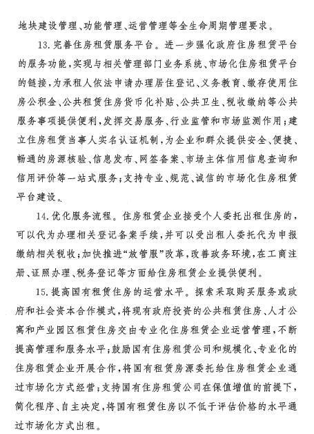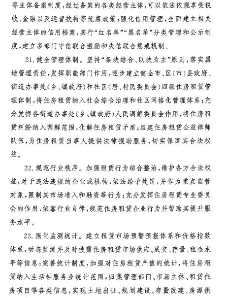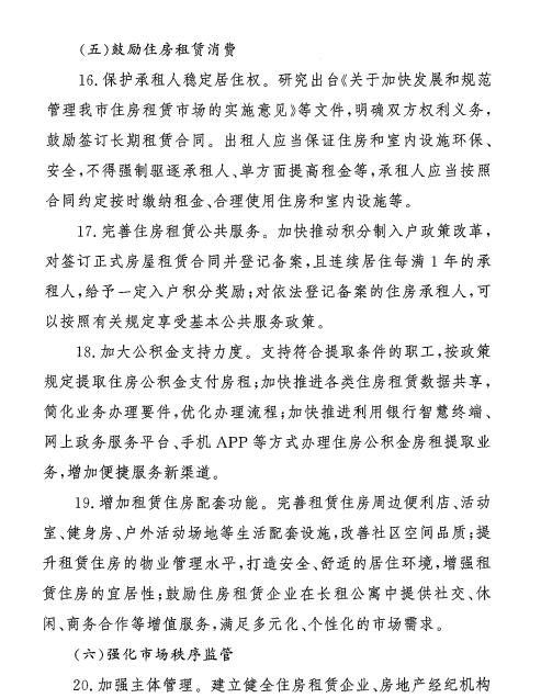 据此,《规划》提出了6个方面23条发展措施,主要包括:一是培育市场供应主体,形成市场化住房租赁企业、房地产开发企业、物业管理企业、中介机构、国有住房租赁公司以及农村集体经济组织等多元化供应主体;二是健全市场供应体系,以市场化供应为主,满足不同人群、不同层次的居住需求,同时,政府提供基本保障,尤其是要强化公共租赁住房保障力度,逐步调整保障方式,全面推行货币化补贴,扩大保障范围,提高补贴标准,引导保障对象通过市场化方式租赁住房解决居住问题;四是增加市场供应规模,在新出让土地中配建租赁性住房,盘活存量租赁房源,加快推进人才公寓和产业园区住房建设,稳妥有序开展利用集体建设用地建设租赁住房试点工作;四是提高市场供应效率,健全租赁住房供地方式,完善住房租赁服务平台,优化政府服务流程,提高国有租赁住房的运营水平;五是鼓励住房租赁消费,健全制度保护承租人稳定居住权,完善住房租赁公共服务,加大公积金支持力度,增加租赁住房配套功能;六是强化市场秩序监管,建立多部门守信联合激励和失信联合惩戒机制,健全市、区(市)县政府、街道办事处(乡、镇政府)和社区(居、村民委员会)四级住房租赁管理体制,将住房租赁纳入社会综合治理和社区网格化管理体系,规范租赁市场秩序,建立租赁市场监测统计体系。